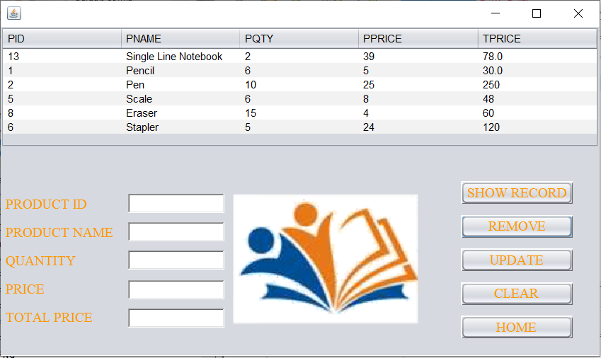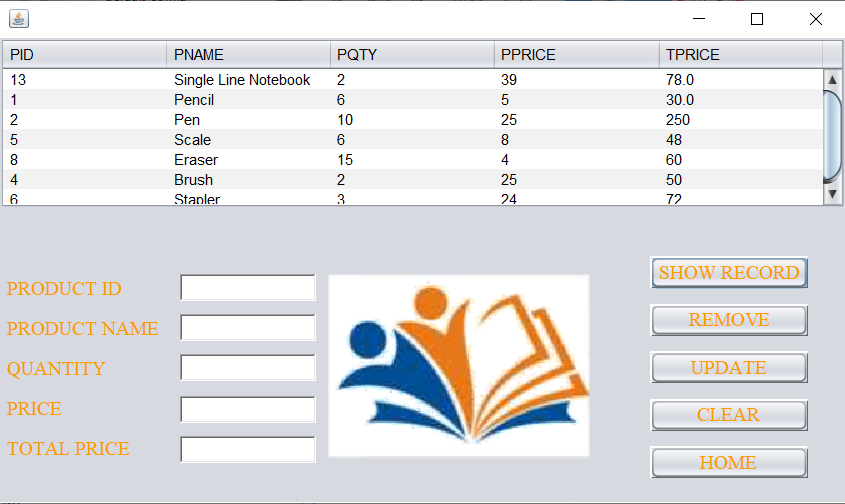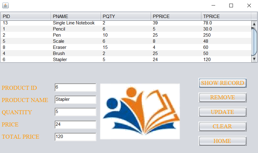 For updating a record simply click on the specific record, the information will be automatically filled in the text field. One just needs to make the required changes in the text field and click the update button. Here the information of product Stapler has been updated.
