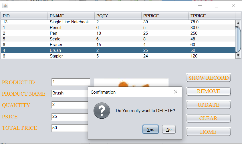 We can remove a record from the database by simply clicking on the specific record you wish to delete from the database and then by clicking on the remove button. When you click on any of the displayed records the information gets automatically filled in the text field. Here the record of product Brush is being deleted.