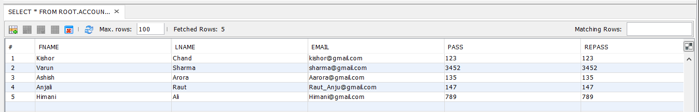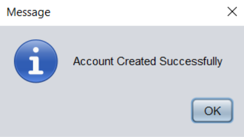 Code: private void jButton1ActionPerformed(java.awt.event.ActionEvent evt) { try{ String fname1 = textField1.getText(); String lname1 = textField5.getText(); String email1 = textField2.getText(); String pass1 = textField6.getText(); String conpass = textField4.getText(); if((conpass.trim().equals(pass1))) { JOptionPane.showMessageDialog(null,"Account Created Successfully"); setVisible(false); } else { JOptionPane.showMessageDialog(null,"Invalid Password"); } pst.setString(1,fname1); pst.setString(2,lname1); pst.setString(3,email1); pst.setString(4,pass1); pst.setString(5,conpass); int res=pst.executeUpdate(); if(res>=1) { JOptionPane.showMessageDialog(null,"Data Inserted Successfully"); setVisible(false); Home h=new Home(); h.setVisible(true); } else { JOptionPane.showMessageDialog(null,"Error Occurred"); } } catch (Exception e) { JOptionPane.showMessageDialog(null,e.getMessage()); } } private void jButton2ActionPerformed(java.awt.event.ActionEvent evt) { System.exit(0); } Output:![]()