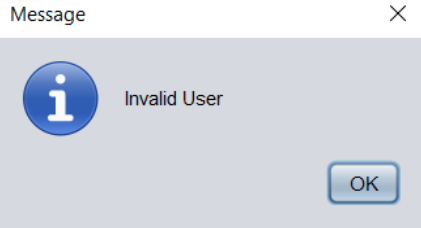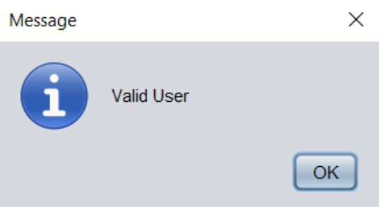 Code: private void jButton1ActionPerformed(java.awt.event.ActionEvent evt) { String user = textField2.getText(); String password = jPasswordField1.getText(); if(user.trim().equals("admin")&&(password.trim().equals("12345"))) { JOptionPane.showMessageDialog(null,"Valid User"); setVisible(false); new Home().setVisible(true); } else if(user.trim().equals("user")&&(password.trim().equals("12345"))) { JOptionPane.showMessageDialog(null,"Valid User"); setVisible(false); new Home().setVisible(true); } else { JOptionPane.showMessageDialog(null,"Invalid User"); } } private void jButton2ActionPerformed(java.awt.event.ActionEvent evt) { System.exit(0); } Output:![]()