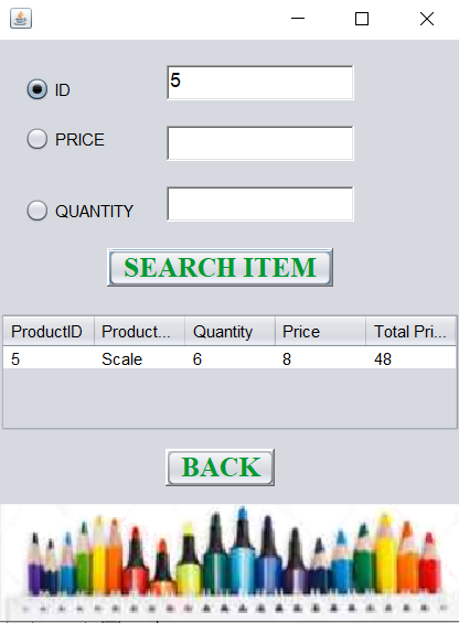 The search page is used to search for a particular product in the database. We can search a particular product using product id, price or quantity. We can also use more than one search option at a time.