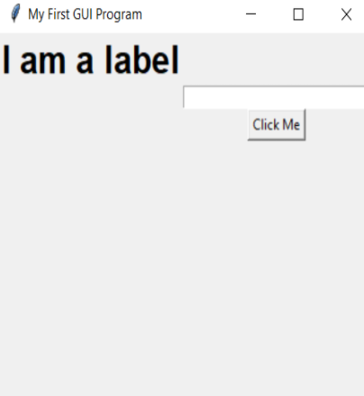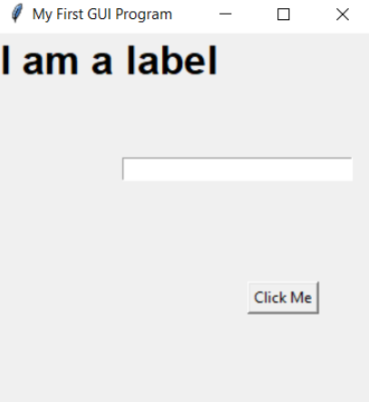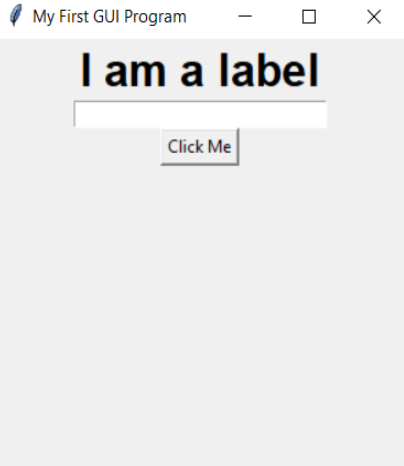 Code: # importing Tkinter module from tkinter import * # creating window object window = Tk() window.title("My First GUI Program") # window title window.minsize(width=300, height=300) # window size # creating Entry my_label = Label(text="I am a label", font=("Arial", 24, "bold")) my_label.pack() # creating Entry input = Entry(width=30) input.pack() # creating Button button = Button(text="Click Me") button.pack() window.mainloop() Output:![]()